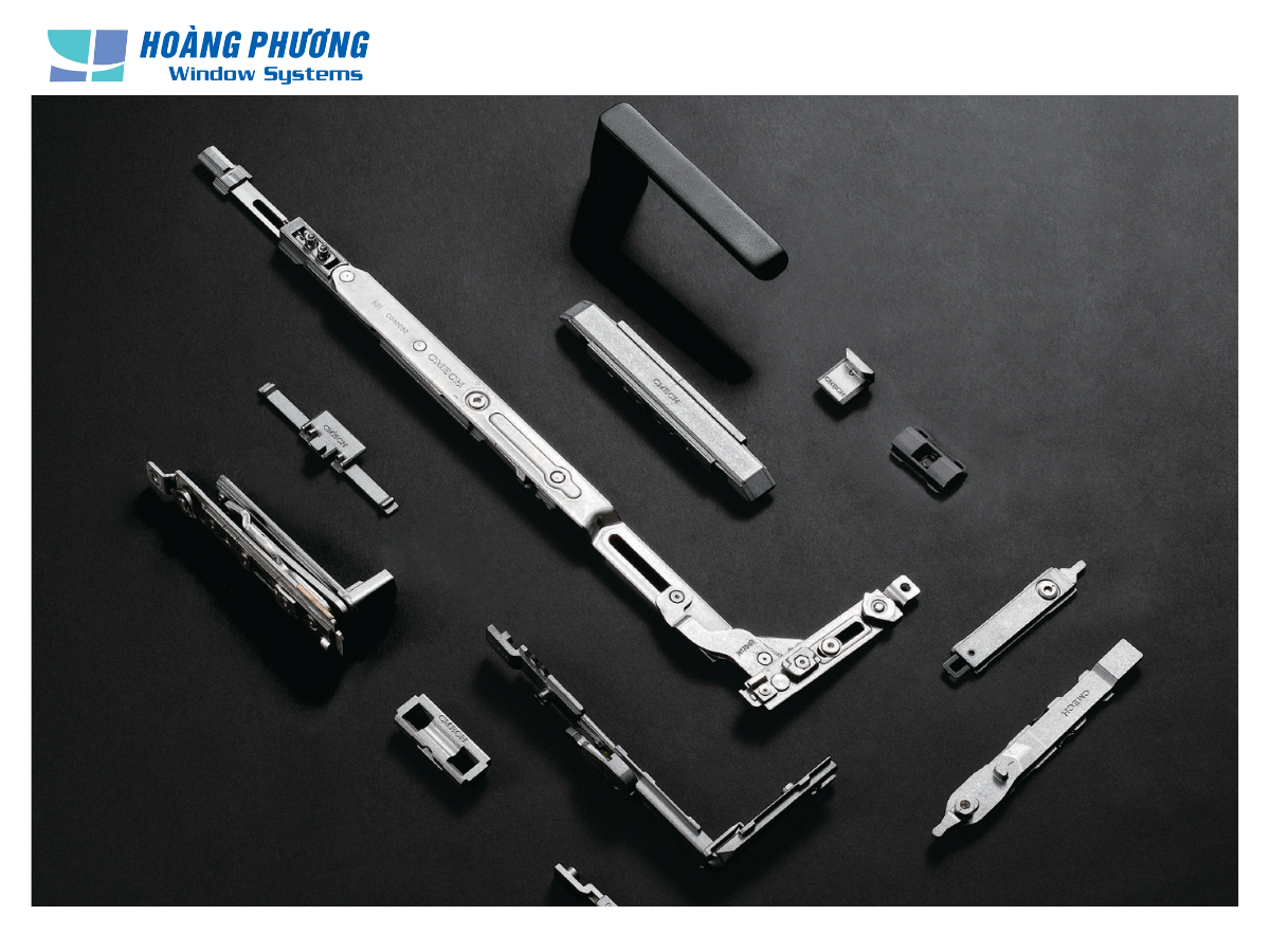 Đa dạng phụ kiện: Tay nắm, bản lề, thanh truyền động (T-Drive, Fork Drive, Spindle Drive), chốt đa điểm, bản lề ma sát… giúp cửa vận hành êm ái, dễ mở và đóng chặt.